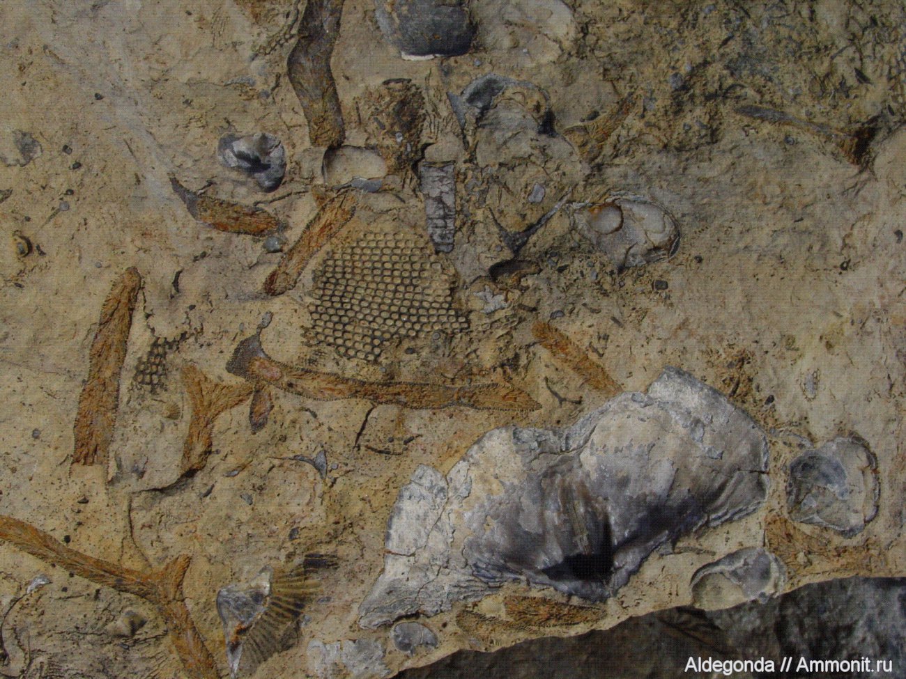 Здесь действительно мшанки и брахиопода, мшанки похожи на Tabulipora ("веточки") и Fenestella ("сеточки"), а брахиопода напоминает кого-то из спириферид.