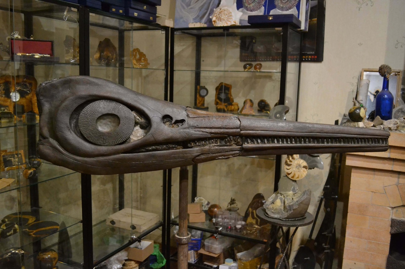 Реконструкция черепа сделана для экспозиции музея Истории Мироздания в г.Дедовск. Реконструкция маска которая накладывается на реальный фрагмент черепа ихтиозавра. Маску можно снять, а фрагмент черепа с зубами и ноздрёй изучать. Без неодимовых магнитов не обошлось.