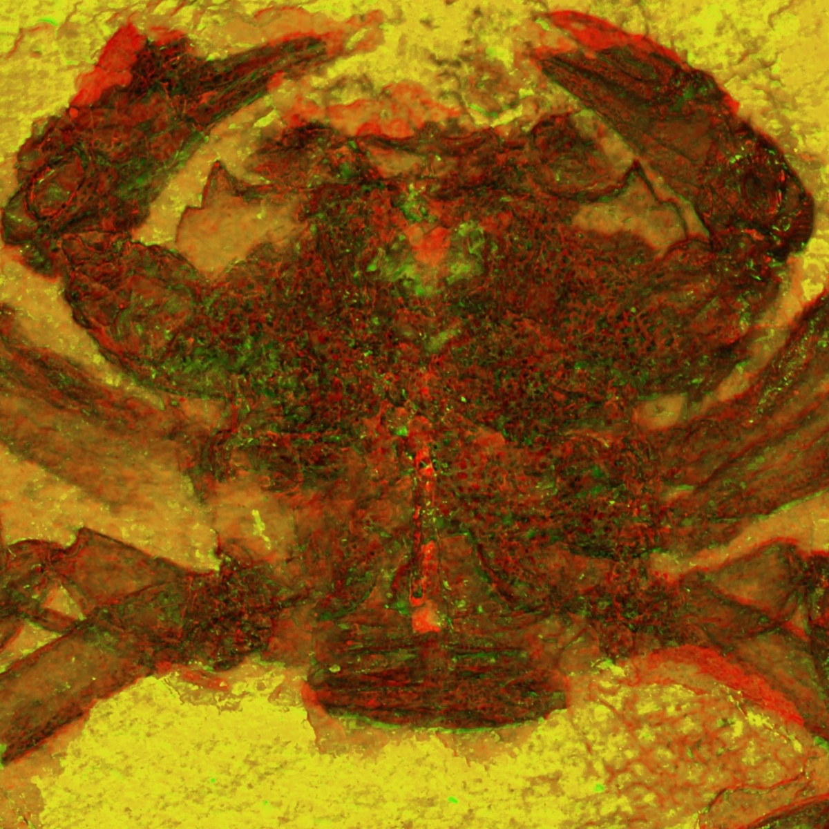 То, что это экстремально уплощенный, но цельный организм, разорванный вдоль плоскости, проходящей от глаз до "чуть выше брюшка", позвляет создать синтетическое изображение. Эдакое, виртуальное сечение, как если бы мы не вскрыли его, разделив на две части, а сделали КТ. Смотрите синтетическое изображение - слияние двух бескрасных каналов от: части с одной стороны плоскости разделения (красный канал), и другой стороны (зелёный канал). На синтетическом изображении виден весь пищеварительный тракт. Кардиальная часть желудка преимущественно попала на одну сторону (зеленая), а передняя часть кишечника - на другую (красная). Ещё лучше стали видны компактизированные до цепочек угольных островков белковые структуры. Кроме расплющенных оболочек, разделявших зоны желудка, угадываются тёмные жабры, оказавшиеся в этом сечении. Специалист, наверное, углядит тут еще многое. По запросам: fossil crab stomach, fossil crab intestine, fossil crab gills - не так уж много документов выдают поисковые машины. Думаю, что поковыряться на "22-м", ради таких остатков ещё стоит.