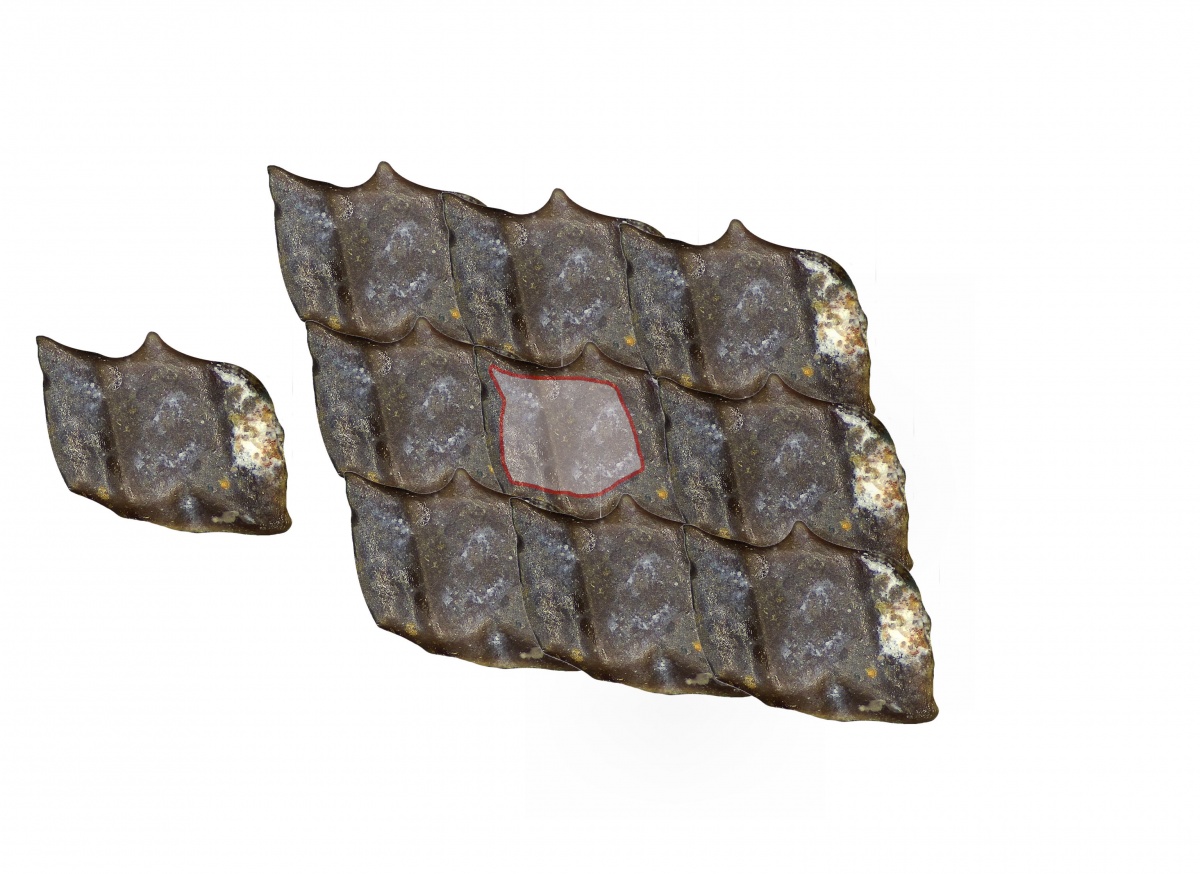 Очередная чешуйка из Заборья. Относительно целая с шипиком сочленения. Если правильно разобрался с этим типом покровных элементов, то картина вырисовывается следующая: