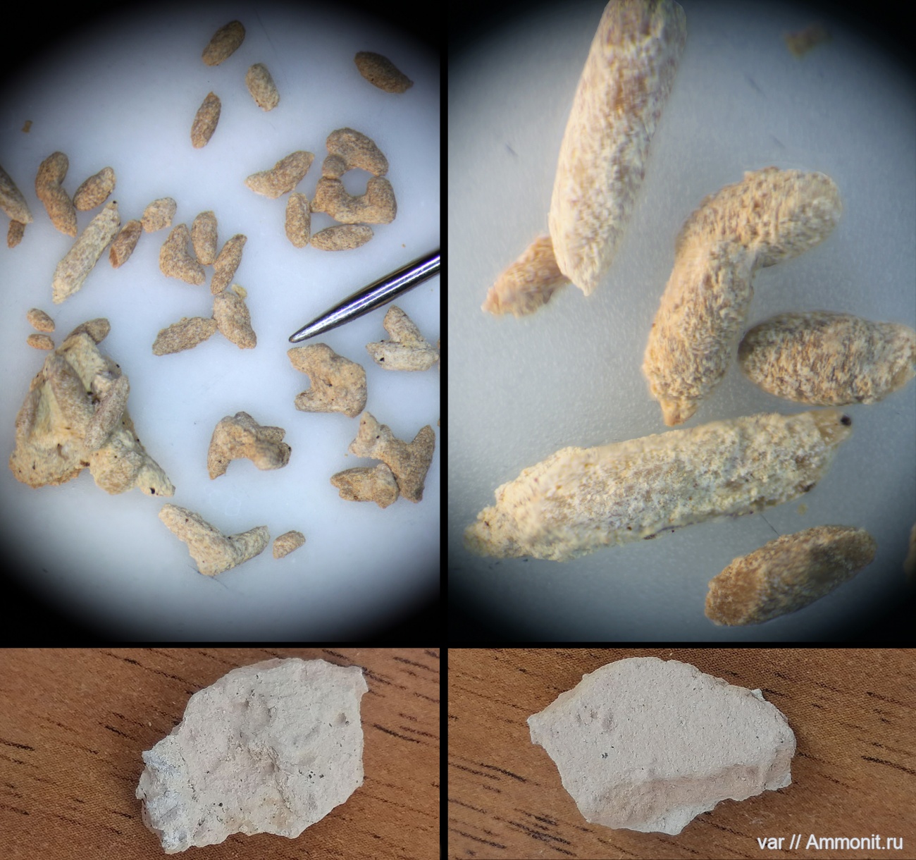 Некоторое время назад от уважаемого Андрея Лентина (AALentin) мной был получен образец юрского горючего сланца (на фото внизу), найденный им в карьере горелых сланцев Яблоновый овраг в Самарской области. На поверхности образца были явственно различимы продолговатые образования размером не более 2-2.5 мм. После растворения образца с использованием соды обнаружилось, что он был буквально «нафарширован» такими образованиями. С разрешения Андрея публикую фотографии «частиц», полученные с помощью тринокулярного микроскопа, при разном увеличении. Игла, использованная для манипуляций с находками и приводимая здесь для масштаба, имеет максимальный диаметр 1.2 мм. Внутренняя структура частиц неразличима. Возможно, это объясняется недостаточным увеличением моего микроскопа. Предполагаю, что частицы – копролиты беспозвоночных. Вторая версия, на мой взгляд, значительно менее вероятная, - фораминиферы.