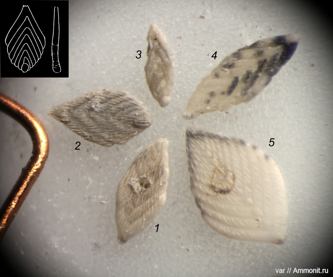 Образцы 1, 2 достаточно, как мне кажется, надежно определены по книге К.И. Кузнецовой и Е.Я. Уманской как Citharinella emendata K.Kuznetsova et Umanskaja. Род Citharinella Marie. Семейство Nodosariidae Ehrenberg, 1838.