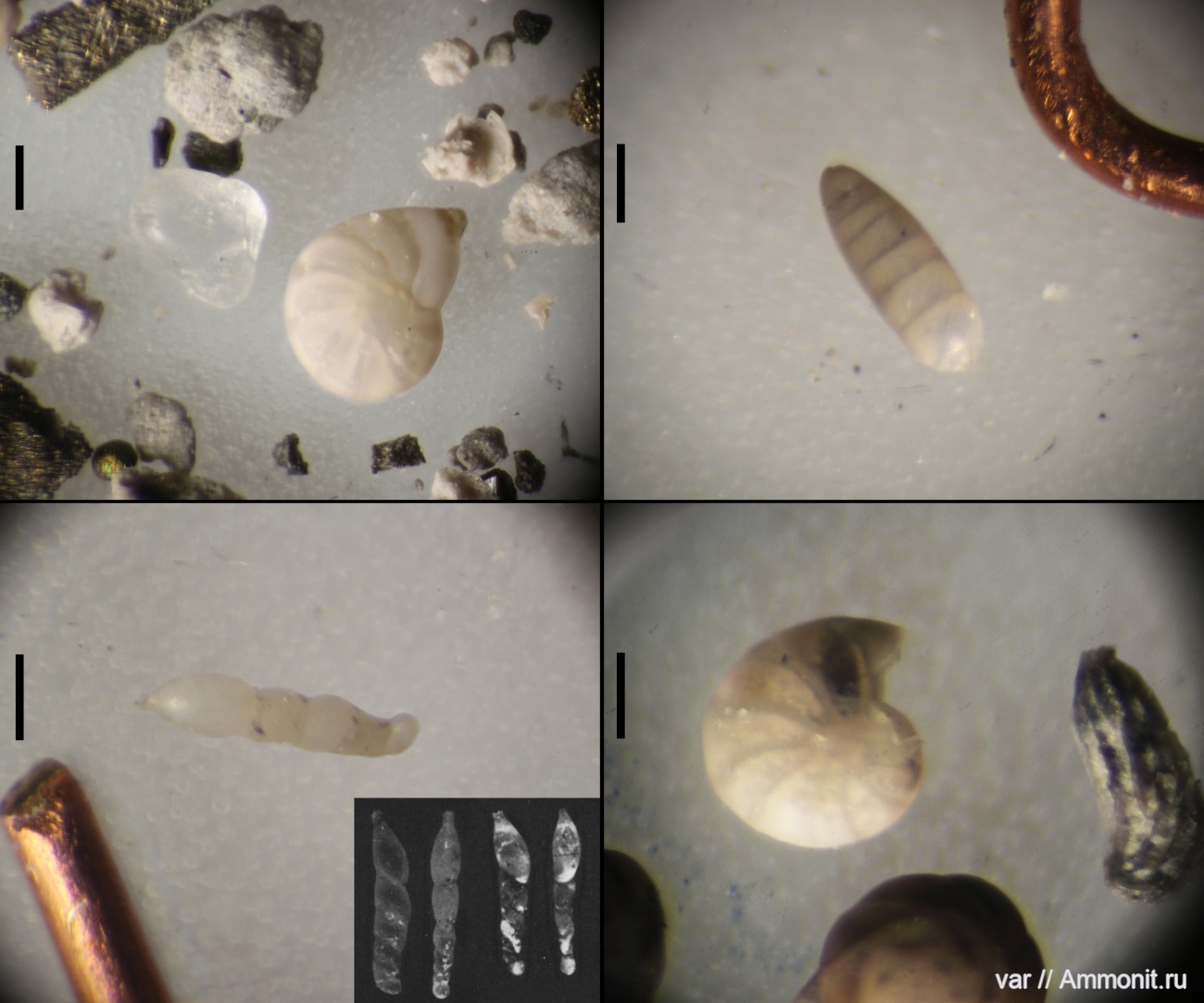 Вверху слева: Lenticulina sp. (?) в окружении пиритизированных спикул губок и прочей мелюзги.