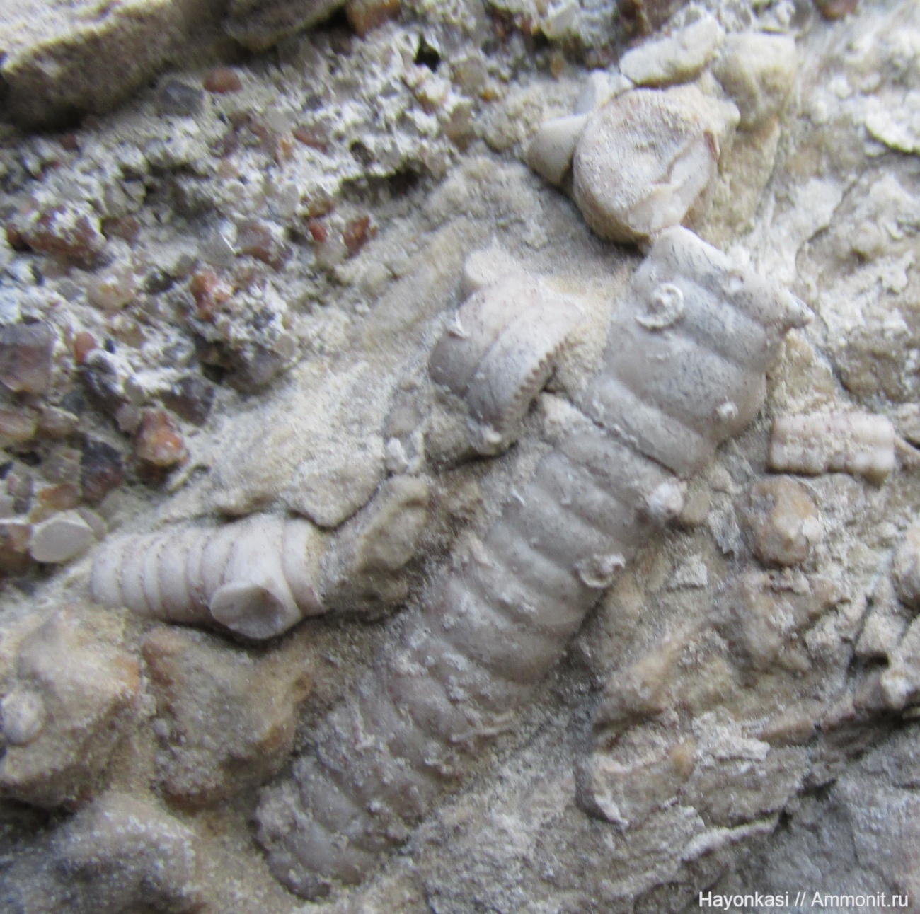 Изредка на обломках криноидей внутри известняковых блоков сохраняются раковинки микроконхид.