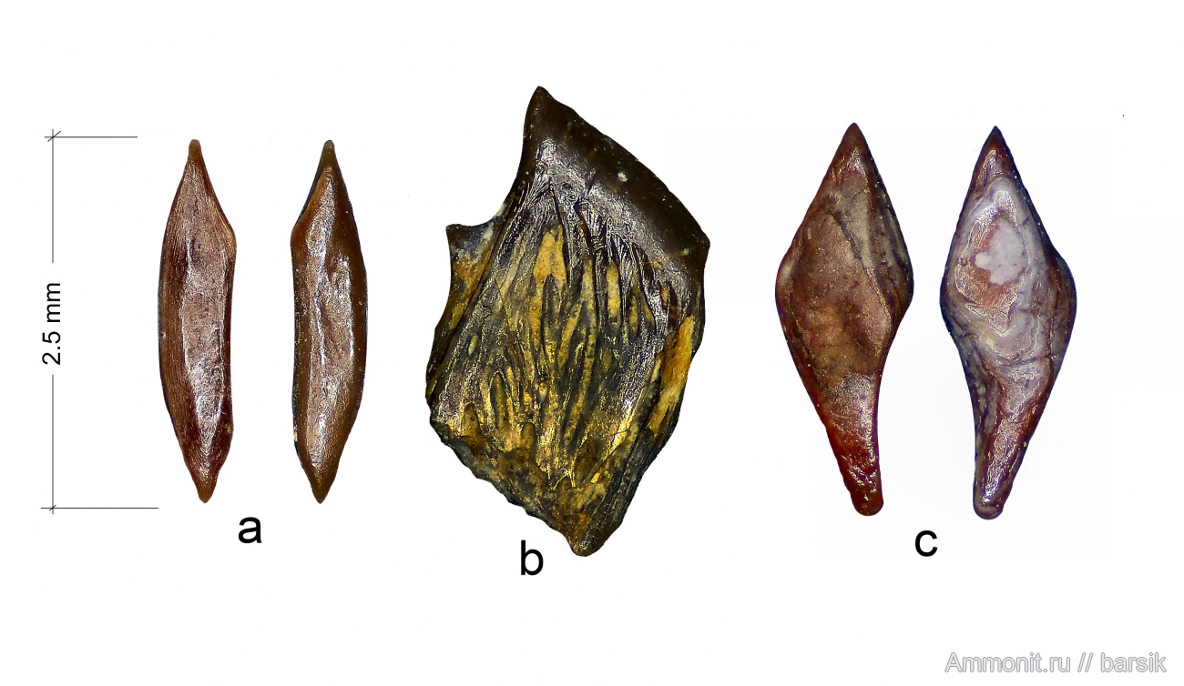 Да, попадаются иногда такие чешуи, правда сильно окатанные и фрагментированные. При том, чаще всего, в процессе окатывания практически полностью уничтожаются все диагностичные признаки, что мы, собственно говоря, наблюдаем на примере чешуй "a" и "c" в Вашей фототаблице. | ||||||