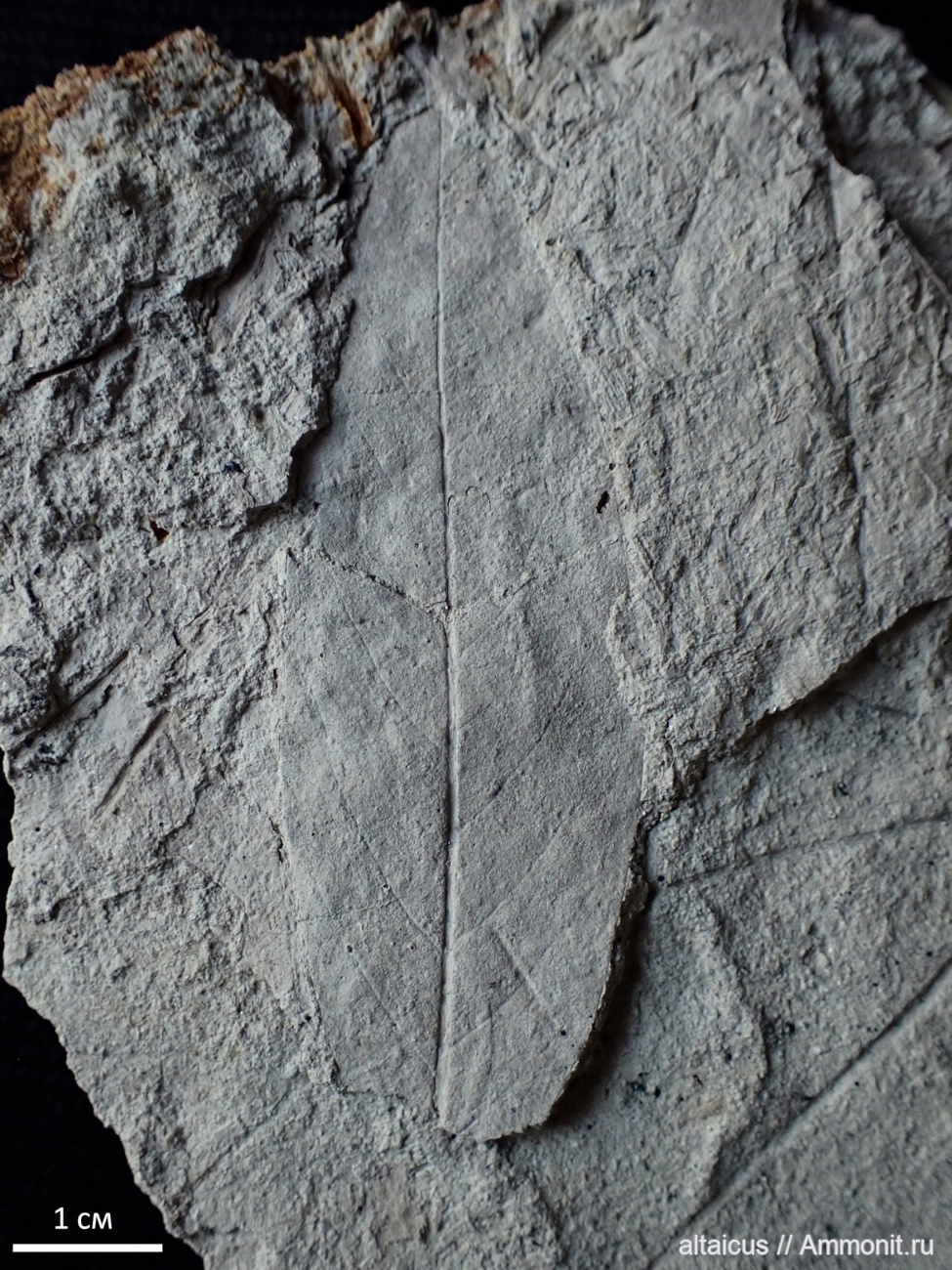 Отпечаток листа Camptodromites sibiricus, аргиллит. Кемеровская область, пос. Антибес, верхний мел, коньякский ярус. Плитка целиком. Там ещё один отпечаток, который вместе с первым лежит на крупном листе Trochodendroides.