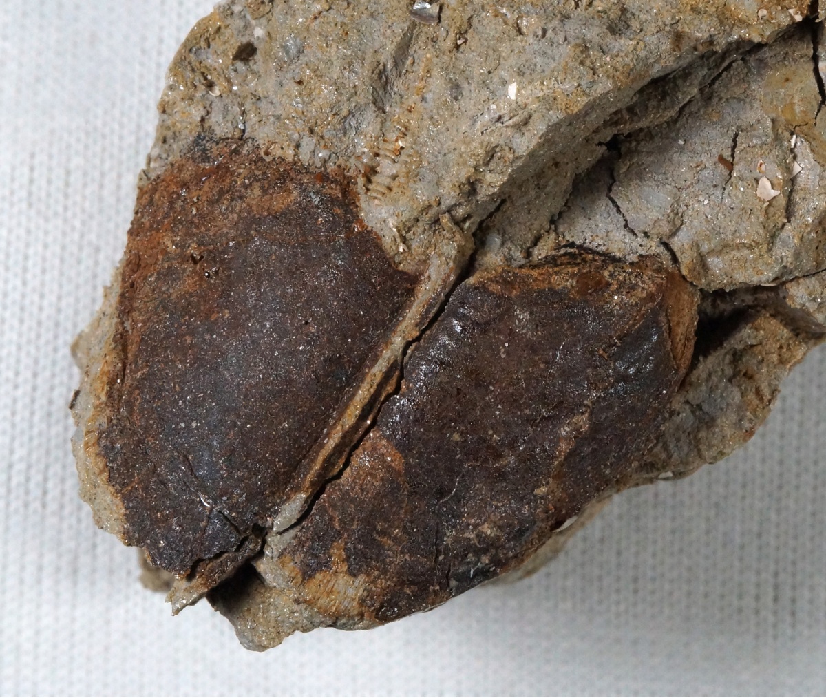 Вторая половинка аптиха отделилась и не так призентабельна, но зато на отслоившемся куске глины сохранились противоотпечатки двух половинок аптиха.
