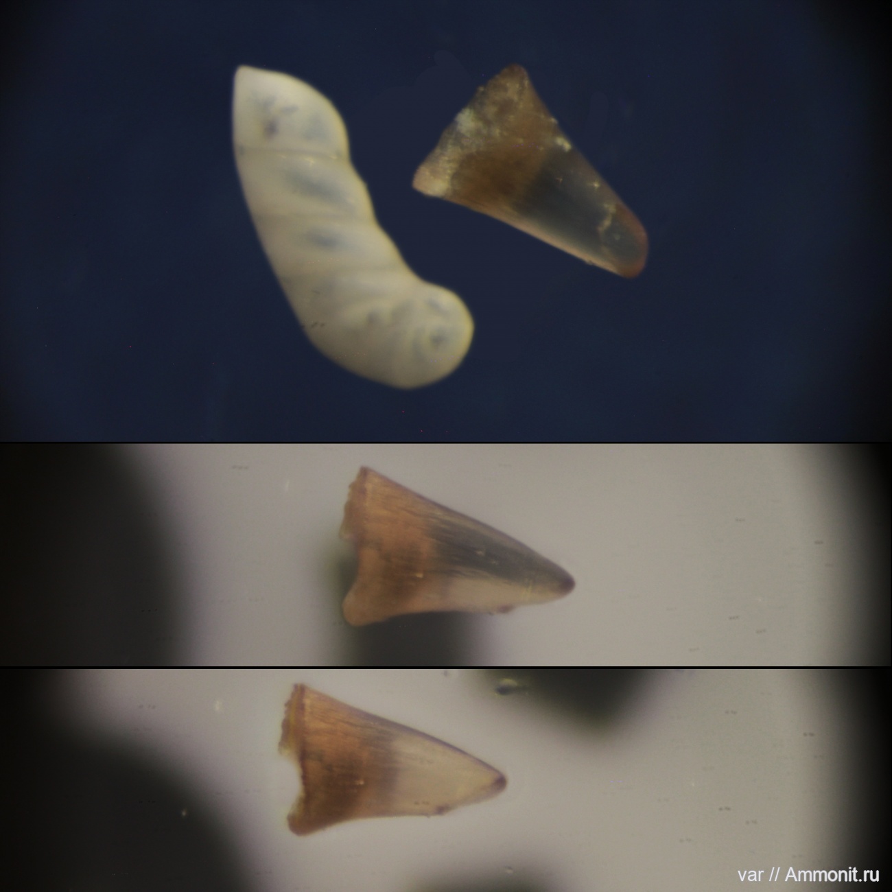 Такое «чудо» вымылось из позднеюрской глины разреза Городищи. Чтобы подчеркнуть миниатюрность зубика, на верхнем фото он помещен рядом с фораминиферой Astacolus sp. (?) размером около 0.5 мм. Кончик зуба слегка поврежден.