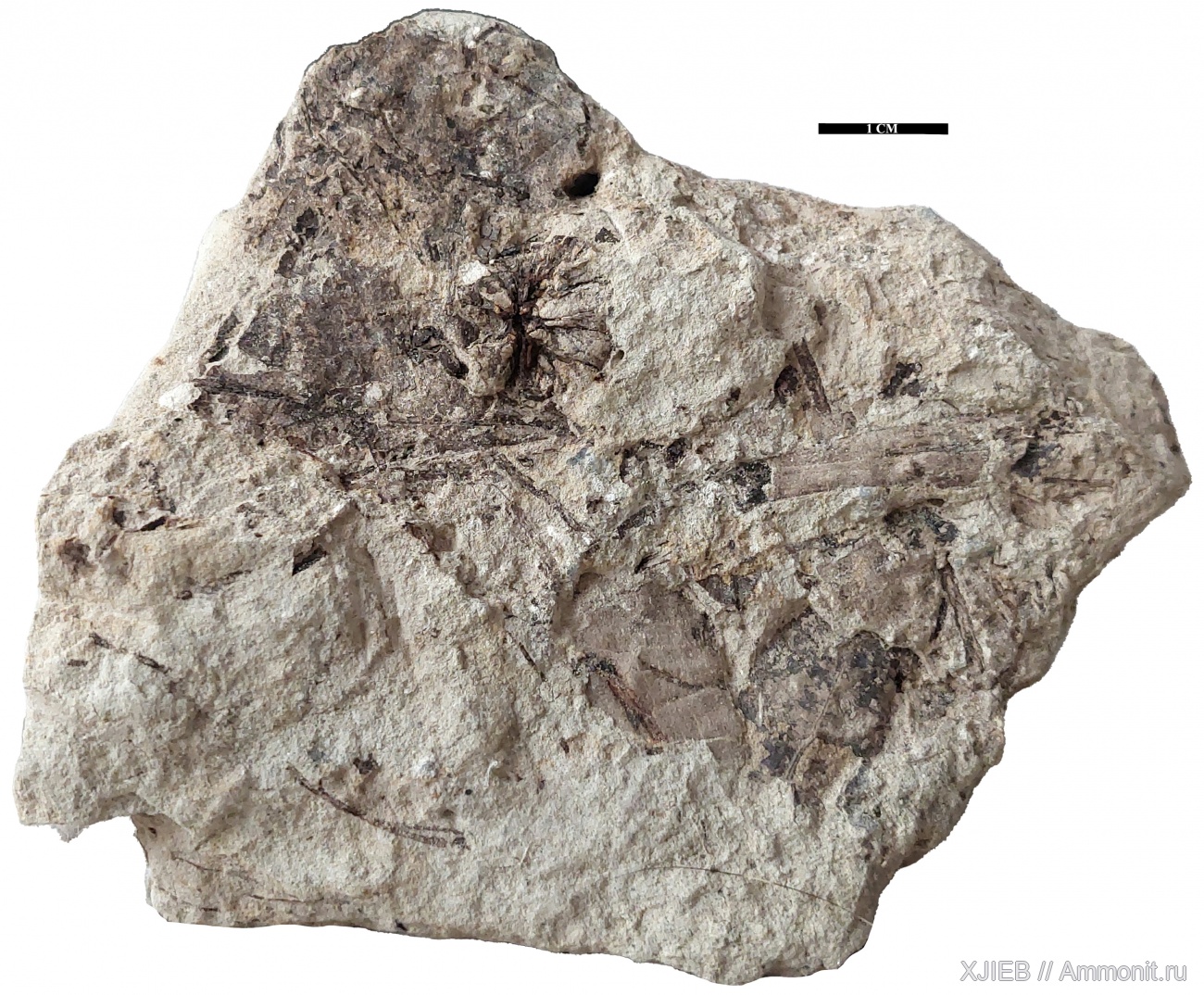 Отпечатки листьев, шишки и веток в рыхлом песчанике.