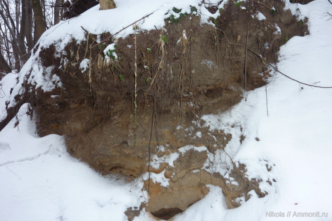 Морена тут. А под ней может быть (?) немного меловых песков, но честно говоря не уверен. Чуть дальше и выше в Кунцево большие толщи этих песков, но пустые, а здесь в ручье если пески эти и есть, то тонкой прослойкой. | ||||||