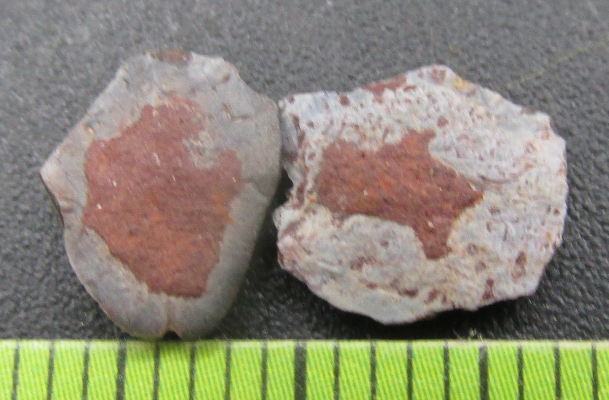 Чешуйки с бугристым орнаментом и гладкой "кромкой" в Псковской области довольно редки, но в Печорах попадаются гораздо чаще, чем в Писковичах. Найдены в прослойке красных глин у дна карьера.