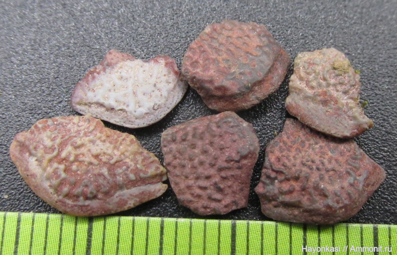 Чешуйки Sarcopterygii с орнаментом и "кромкой"; найдены в прослойке красных глин на высоте 2-3 м от дна карьера.