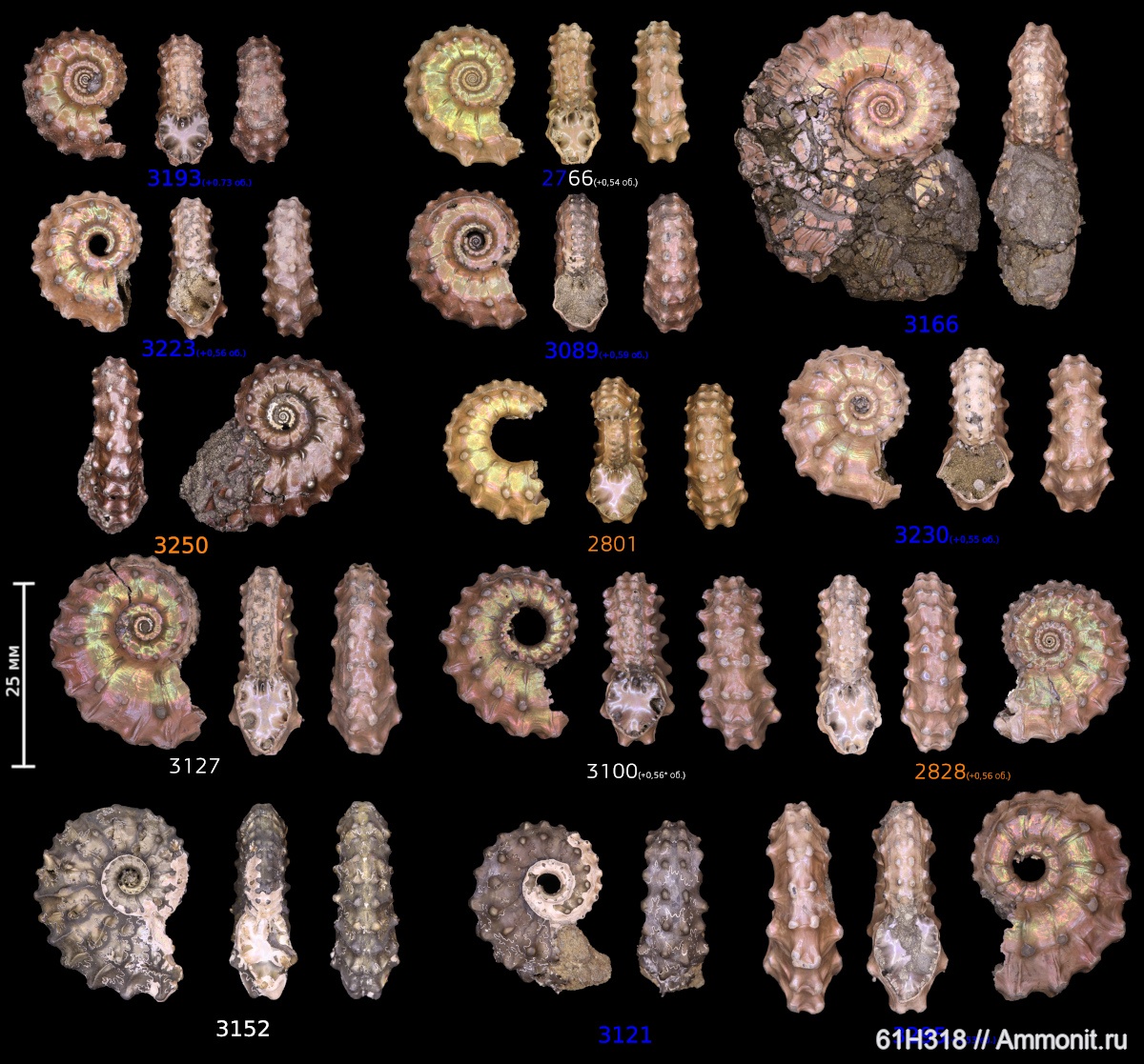 Оранжевый цвет подписи — раковина лежала в слое с Erymnoceras’ами, белый — в среднем келловее выше слоя Erymnoceras’ов, синий — верхний келловей. В скобках указано угловое расстояние в оборотах от конца фрагмокона до устья (± соответствует следу от раковины на фрагмоконе).