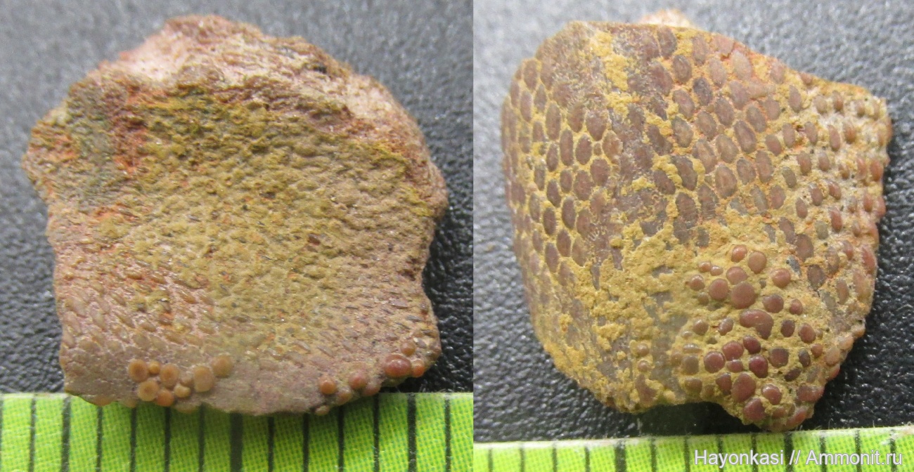 Фрагмент бранхиальной пластинки бесчелюстного Псаммостеиды (предположительно Psammosteus sp.). При жизни животного была повреждена; на месте повреждений образовались вторичные бугорки.