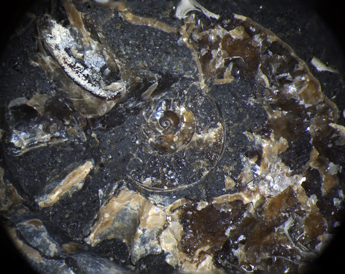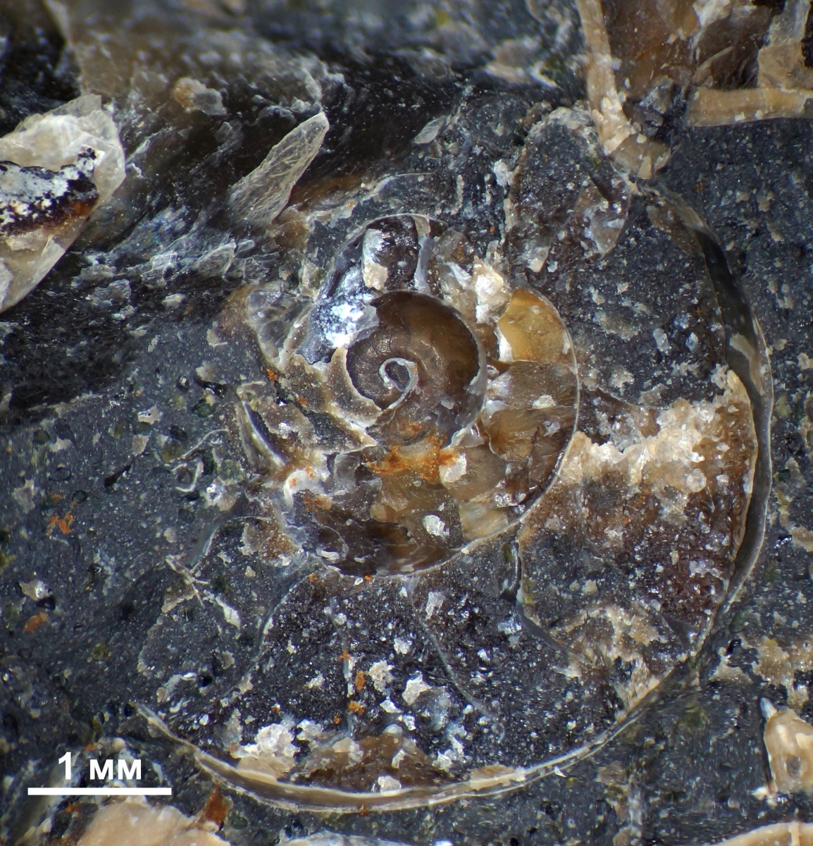 На одной из сторон конкреции обнаружена сохранившаяся аммонителла разрушенного ядра аммонита Simbirskites.