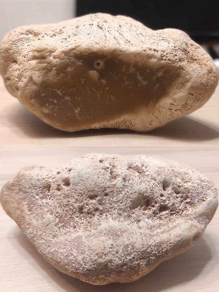 На этом фото в самом основании губки образовался кремень. Видимо она была погребена под карбонатными отложениями и подвержена в дальнейшем воздействию грунтовых вод, насыщенных тем самым кремнезёмом, ну а потом уже ледник отполировал её чуток.