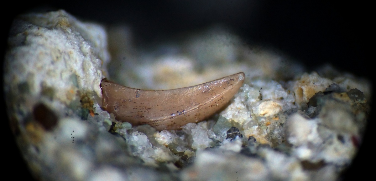 В ходе разламывания небольшого куска песчано-глиняного конгломерата нижнего триаса удачно открылся интересный зуб.