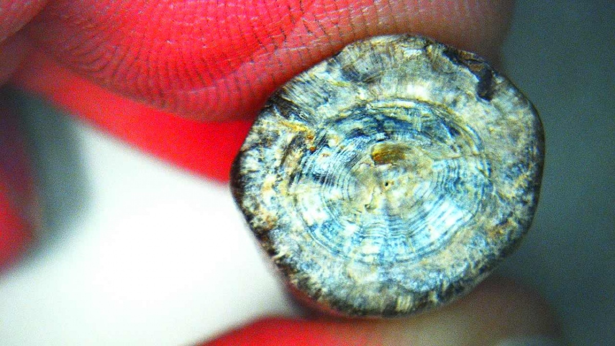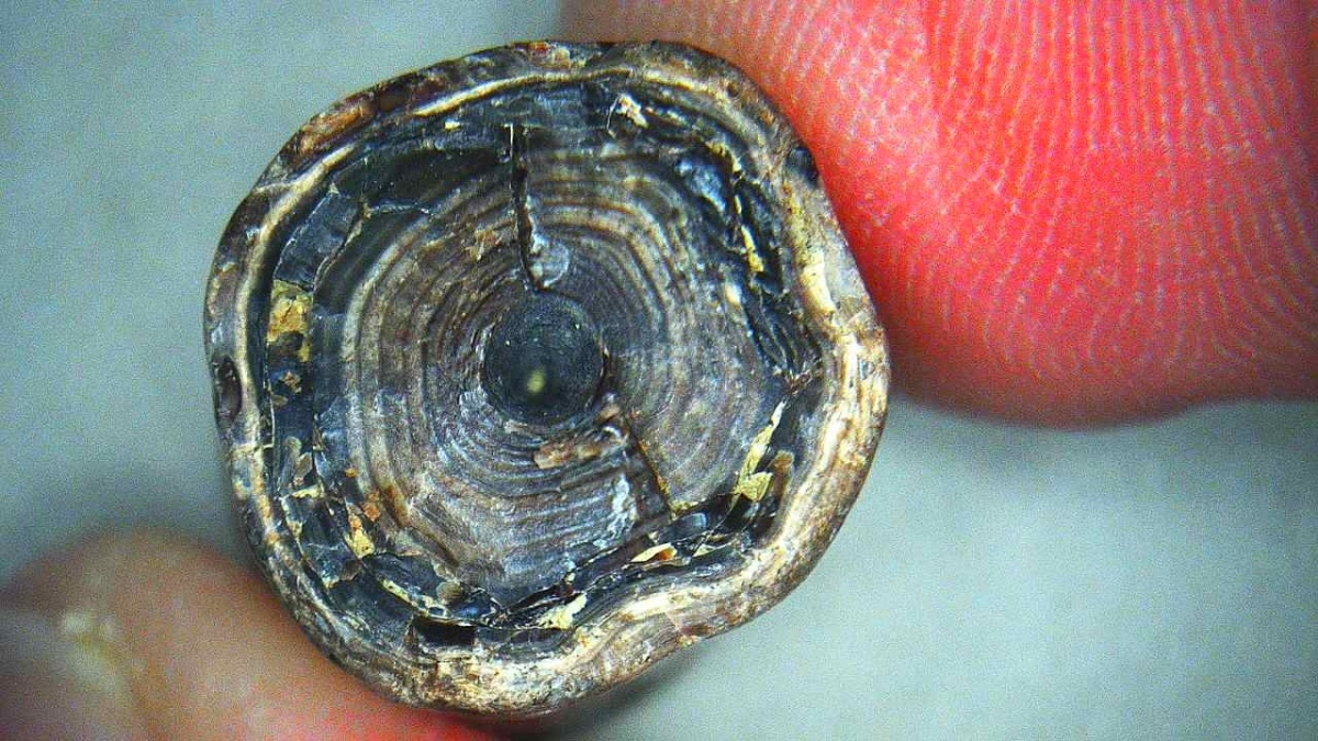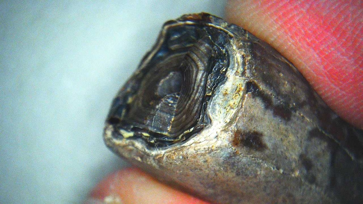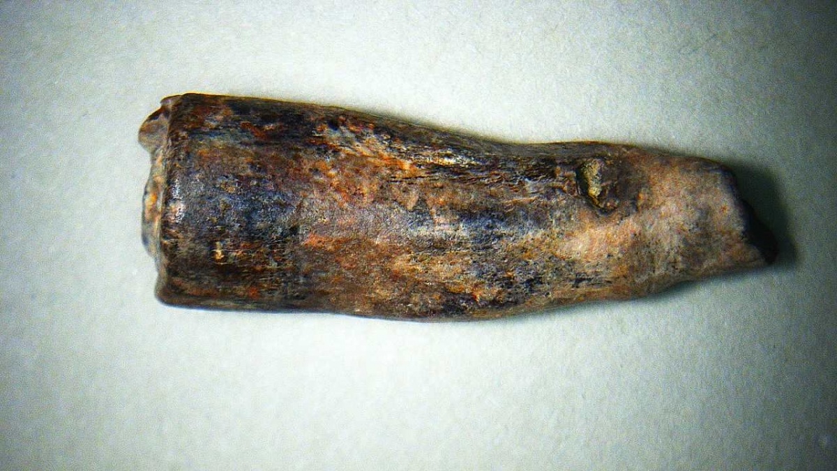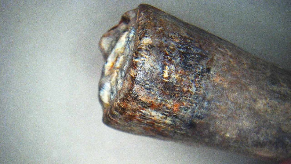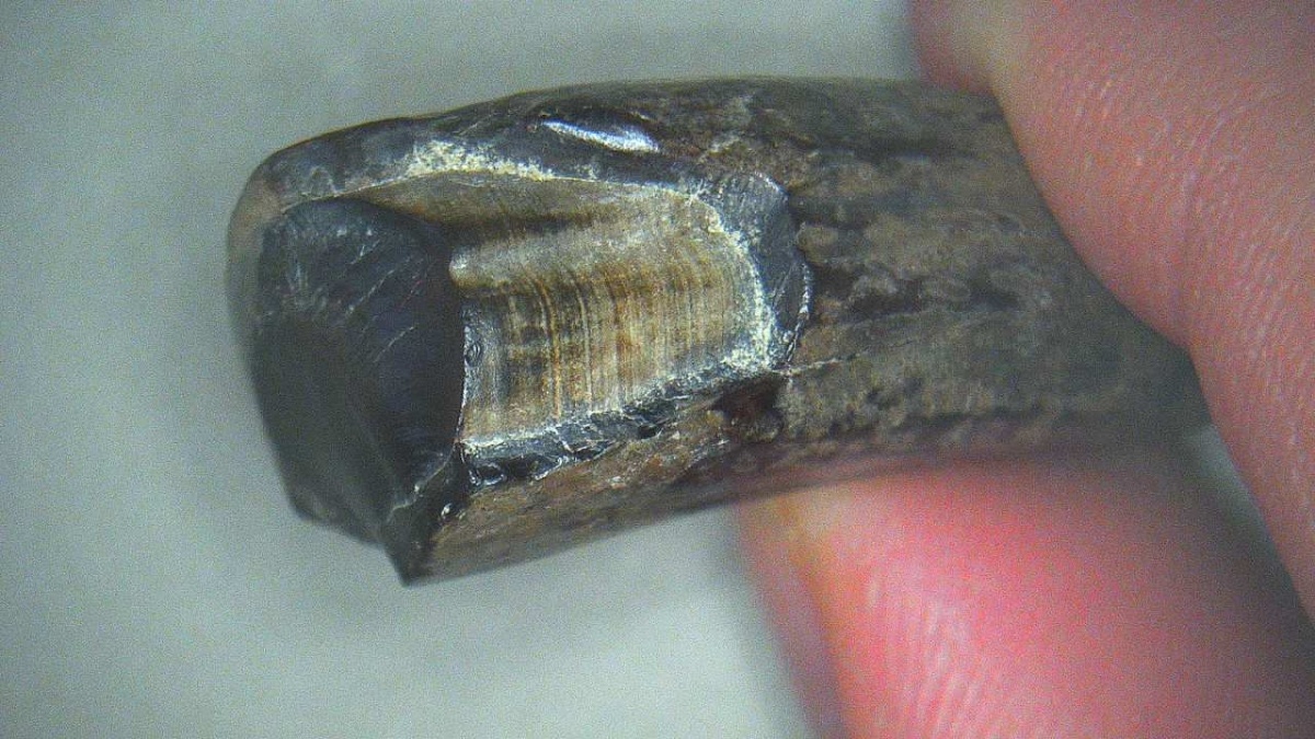На торцах всех зубов отчётливо виден центральный канал и слоистость "годичные кольца", На поверхности зуба №2 видна фактура коронки.