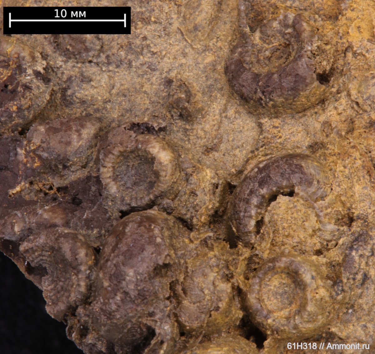 Второй вариант сохрана в Кужанаке - раковины на поверхности известняковой плиты. В нижнем левом углу виден также пупок половинки аммонита. В самой породе пупок тоже сохраняется, но расчистить его нереально - аммониты более хрупкие, чем вмещающая порода.