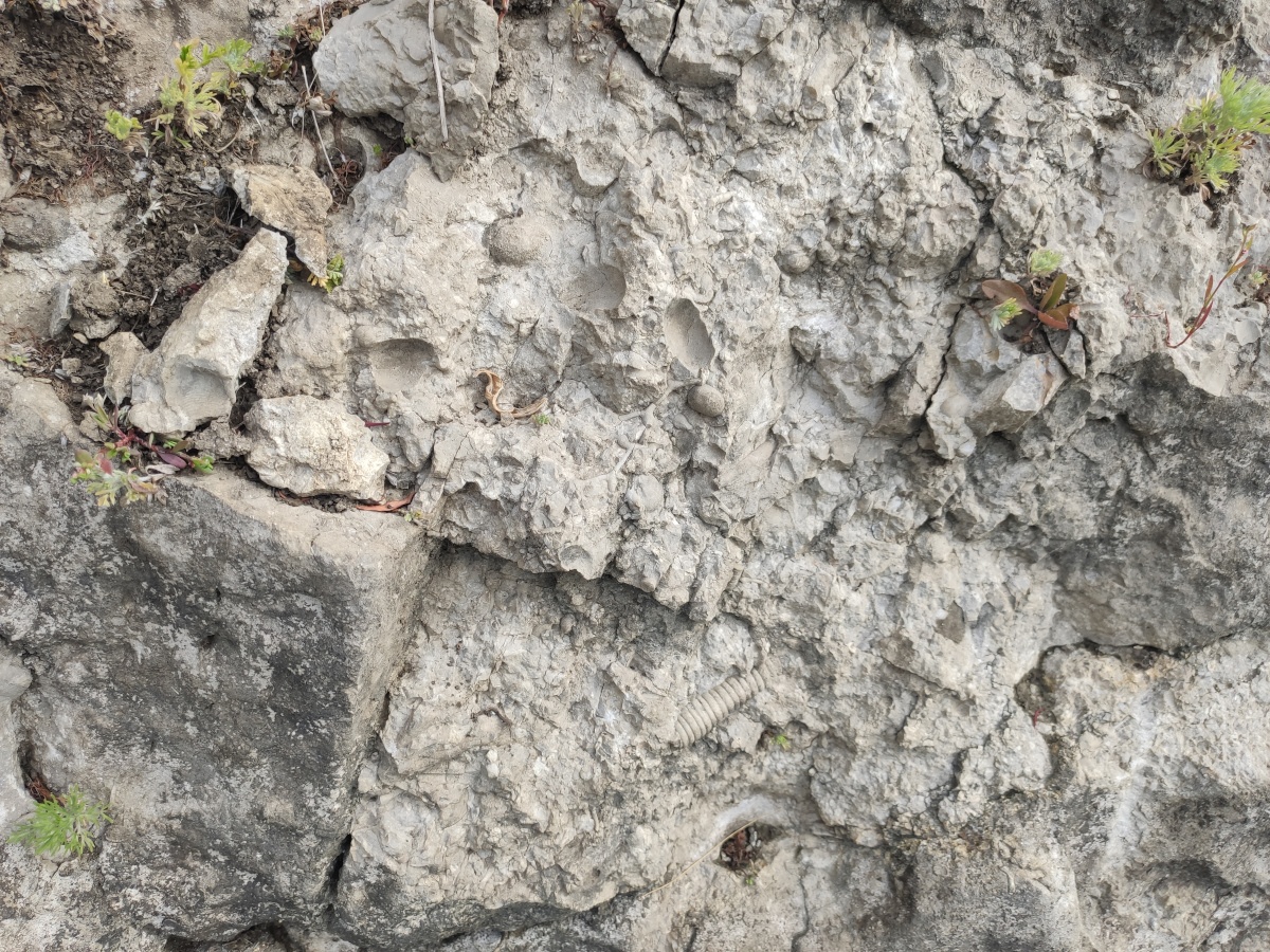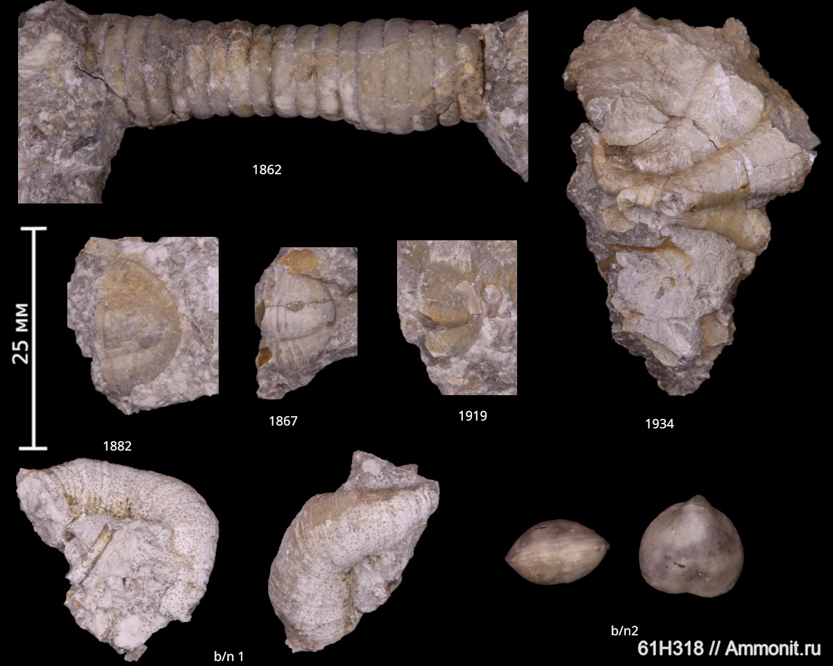 Помимо аммонитов, в известняках Кардаиловки встречается довольно много разнообразной мелочёвки: щитки триллобитов (1882, 1867, 1919), мелкие ругозы (1934, b/n1), брахиоподы (b/n2). 1862 (фото в кореннике) - наверное, стебель морской лилии, но смущают периодические утолщения.