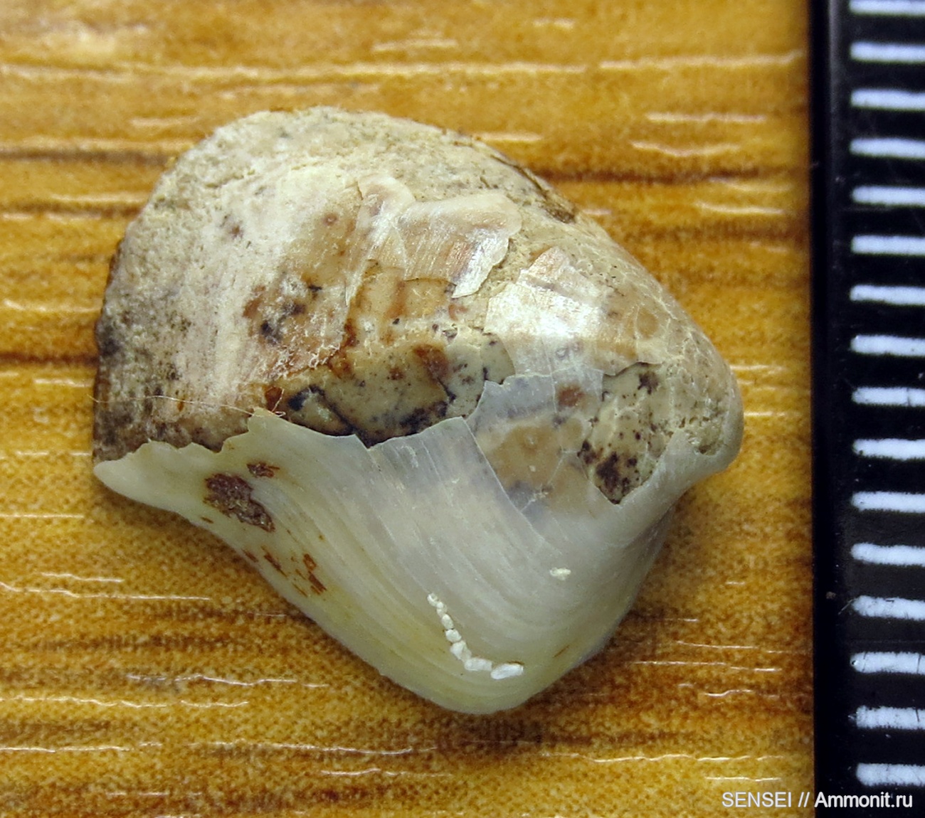 На остатках раковины сохранился поселенец в виде фораминиферы Meandroloculina sp.cf.