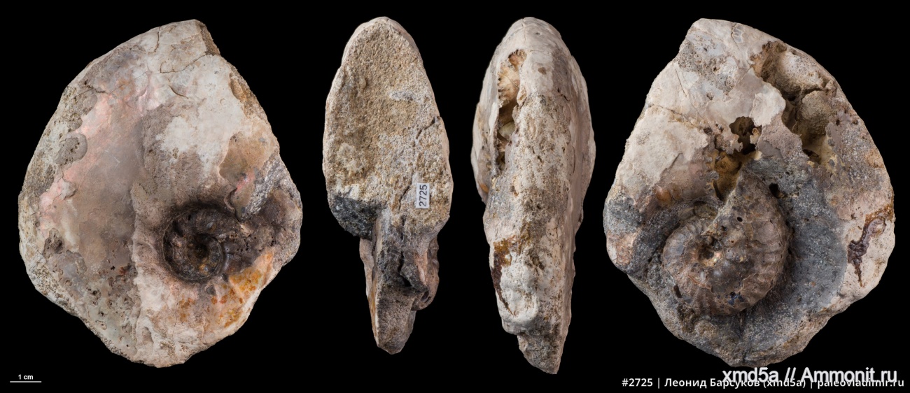 Аммонит совсем не музейный, но с научной точки зрения это достаточно важный образец. Мы с sergeisam интересуемся вопросом Anadesmoceras-подобных аммонитов Владимирской области. Среди них встречаются образцы, которые не подходят ни под один описанный вид (или даже род?). Данный образец сложно отнести к какому-либо виду Anadesmoceras (возможно это вообще не A.). Из описанных A. это мог бы быть A. subbaylei Spath, 1942 (потому что только это вид A. имеет ярко выраженные рёбра), но оригинальное описание найти не удалось. Этот же вид был описан в статье СТРАТИГРАФИЯ И АММОНИТЫ АЛЬБА р. ЕЗА (русская плита) Барабошкин Е.Ю. 1,2, Медов С.А. 3, Никульшин А.С. 4" (Фото) но начальные обороты там не изображены. Зато есть описание более ранних (судя по масштабу) оборотов A. subbaylei в статье Ammonite faunas and biostratigraphy of the Albian to Middle Cenomanian (Cretaceous) in western Korjak-Kamchatka, N E Russia By A. Alabushev, Tübingen 1995 (Фото1, Фото2) но начальные обороты этих аммонитов вообще не имеют ребристости.