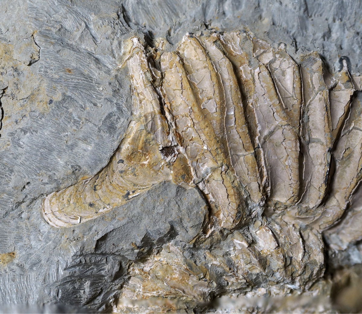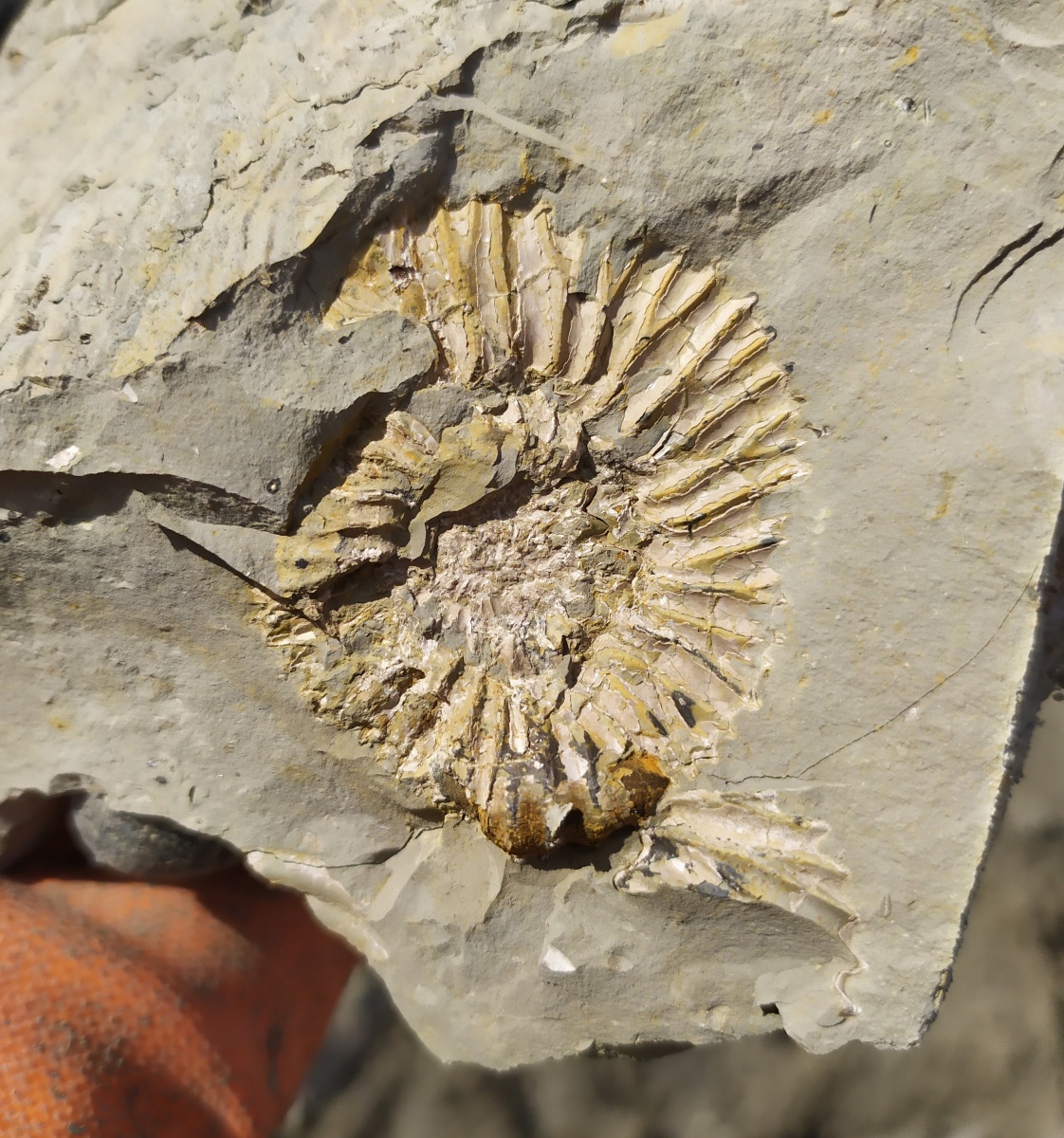Аммонит удачно открылся при расслаивании глины, извлечённой из коренных пород верхнего кимериджа.