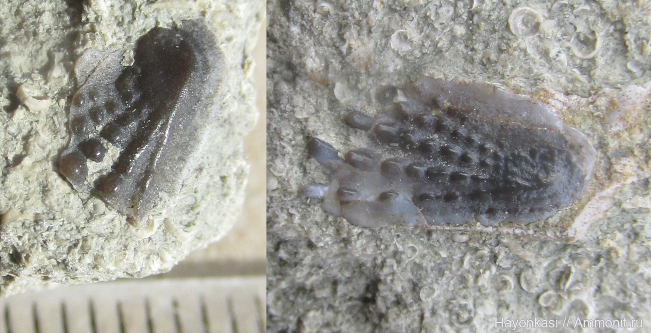 Небольшие зубные пластины двоякодышащих рыб в порховском мергеле. Чёрный/тёмно-серый цвет характерен для порховских находок.