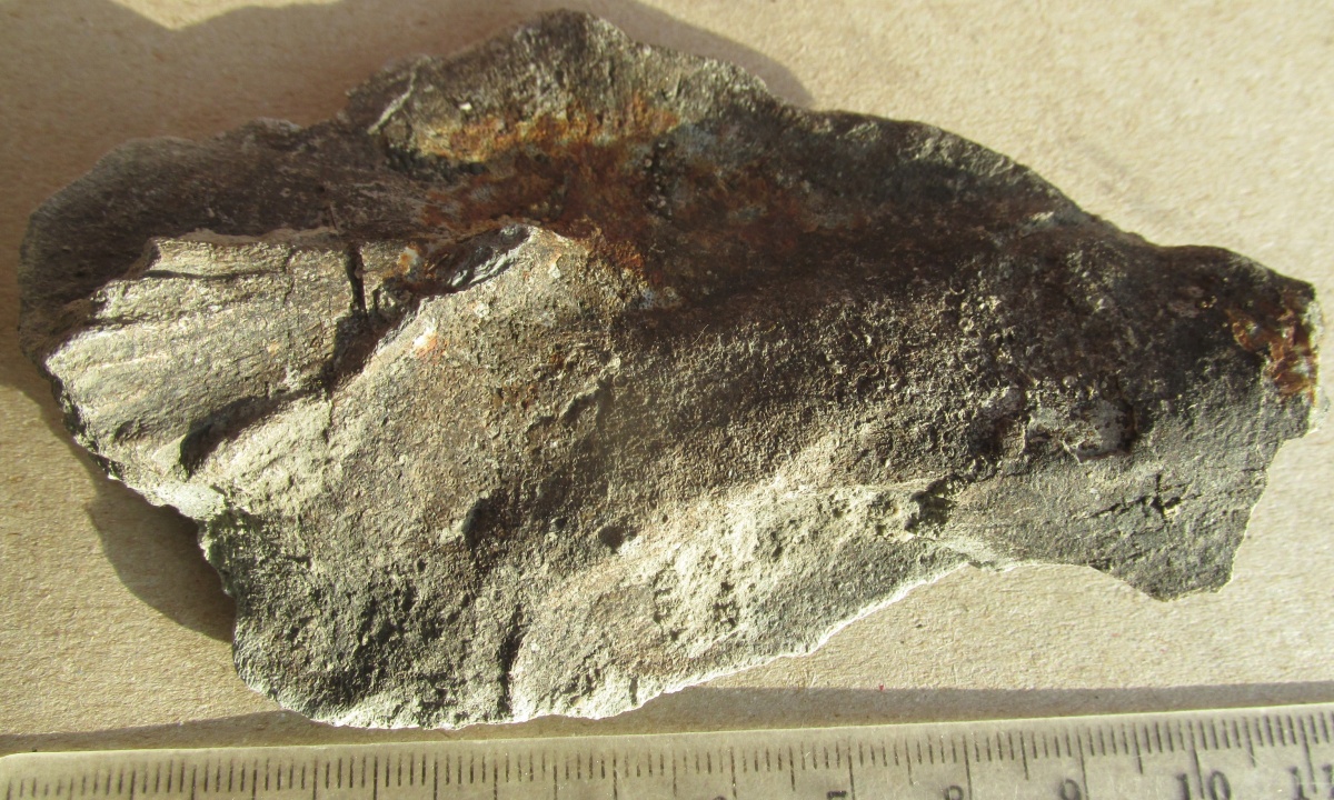 Крупная покровная пластина плакодермы Arthrodira, предположительно Plourdosteus sp. Выпала из мергеля. Вид снизу.