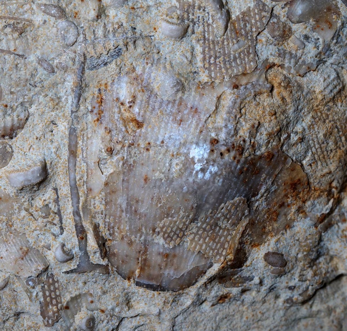 Через повреждения в раковине брахиоподы видны руки офиуры.