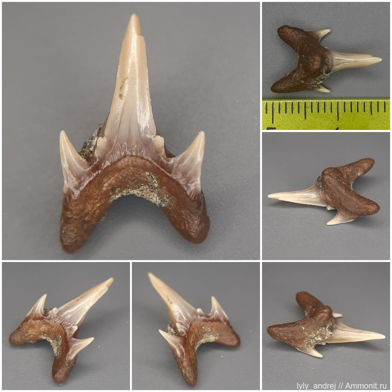 Дома обнаружил данный зуб Protolamna со странными "латеральными" зубцами на основной коронке (патология? аномалия?).