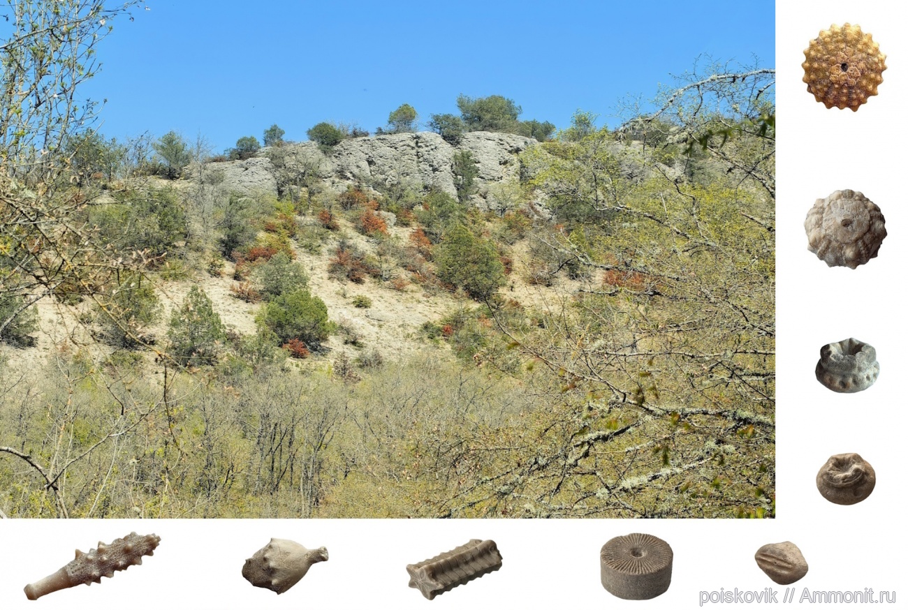 В окрестностях села Родное (44.541353 33.723564) в верхнеберриасских отложениях встречаются морские ежи, фрагменты морских лилий, губки, пластинки морских звезд и др. (см. Берриасский биогерм у с.Родное )