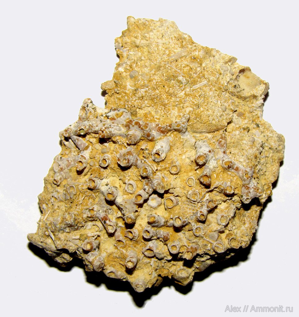 Они на чем только не росли. Здесь на фото исключение из правил, Aulopora непонятно на чем, не на мшанке и не на коралле. | ||||||