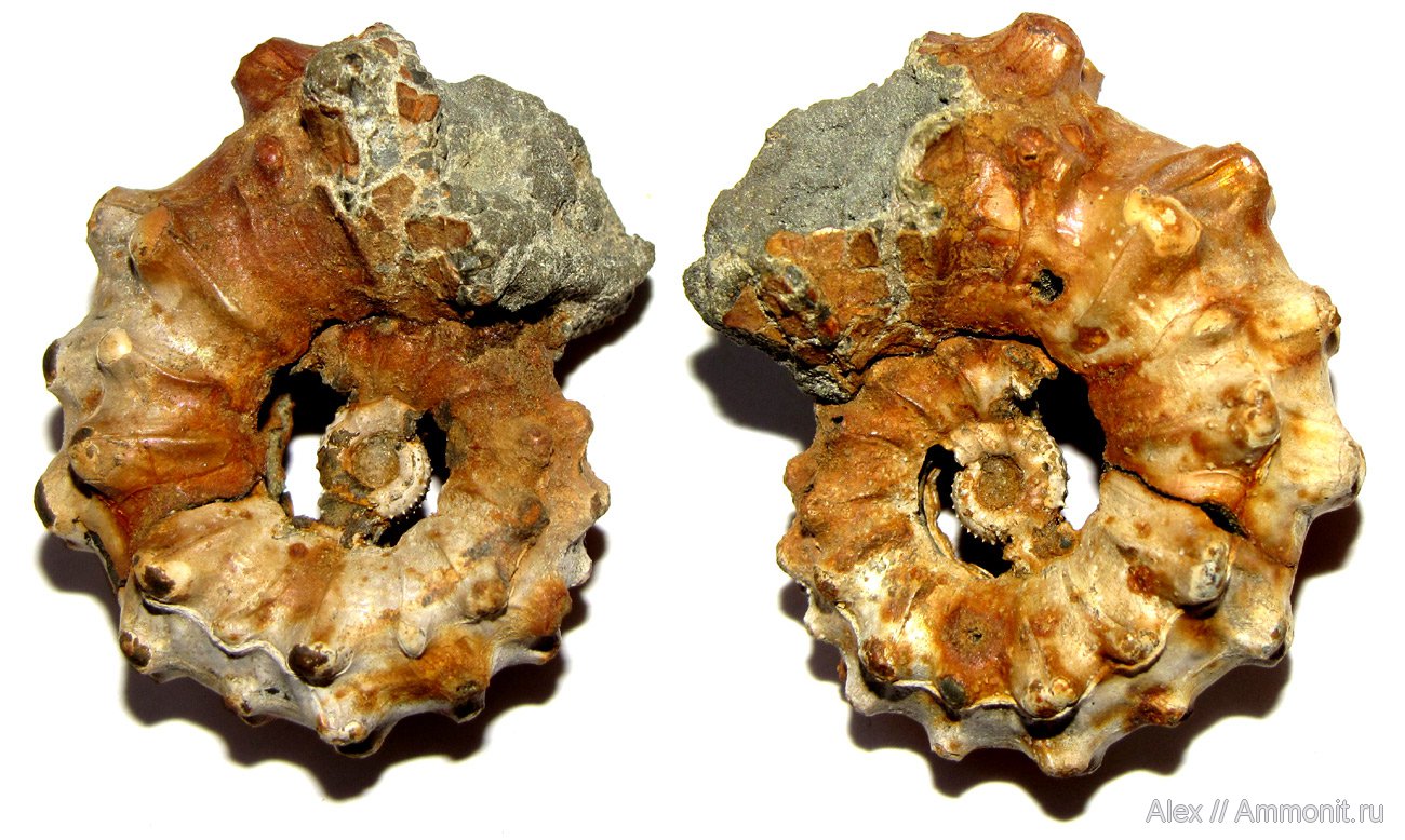Фотографию этого аммонита плохой сохранности я размещаю потому, что на нем хорошо видно, какая раковина была у него в детстве и что из нее в итоге выросло. К сожалению, этому аммониту не повезло, он провел в отвалах не меньше года. Тем не менее, это очень показательный образец - видно, что в начале жизни шипики на раковине росли в ряд, а сама раковина была почти гладкой.