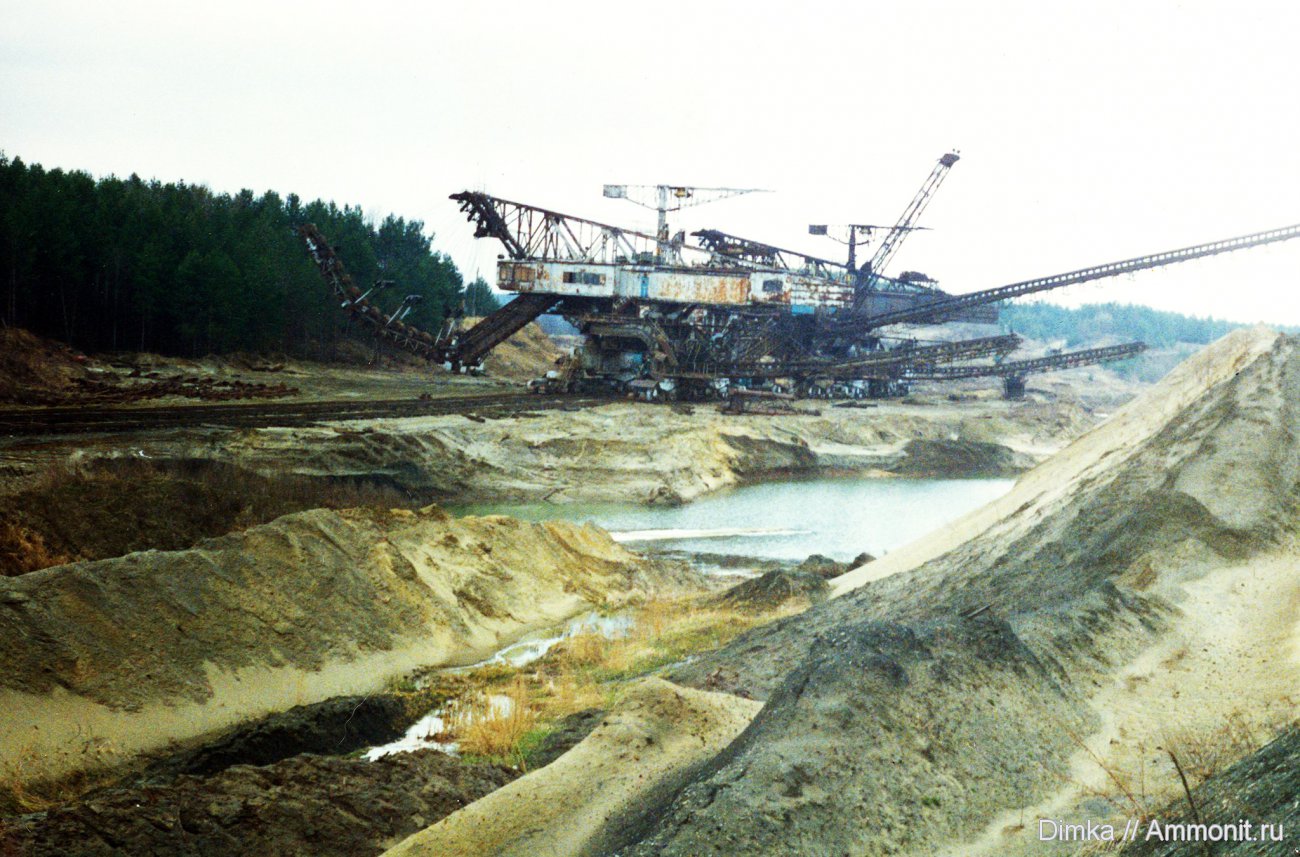Елкинский карьер (№10) в период затопления, доступен слой Riasanites rjasanensis и экскаватор. Фотография сделана 26.04.1997 года.