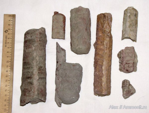 Фрагменты раковин Endocerida различных видов. Точнее, это даже не фрагменты раковин, а фрагменты слепков раковин, сами раковины у эндоцерасов сохраняются редко.