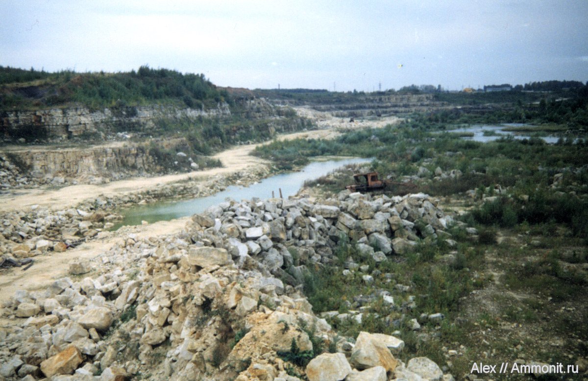 Старая отсканированная фотография Домодедовского карьера. Я сфотографировал карьер на пленочный фотоаппарат в 1999 году. Здесь карьер производит впечатления заброшенного, но это было не так, просто разработка велась вдали (если присмотреться, то виден свежий известняк) и слева от фотографа (за кадром). Фотография сделана со старых отвалов, которые сейчас полностью погребены под юрской глиной.