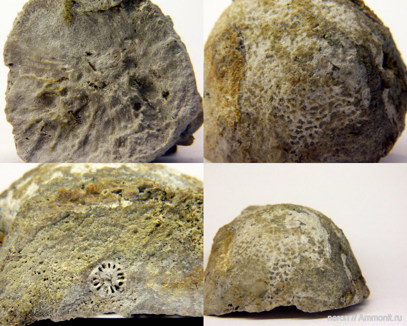 1. Вид снизу. Видно основание коралла из центра уходит вправо 2. Вид сверху 3,4. Вид сбоку. Поперечный срез коралла виден на одном боку.