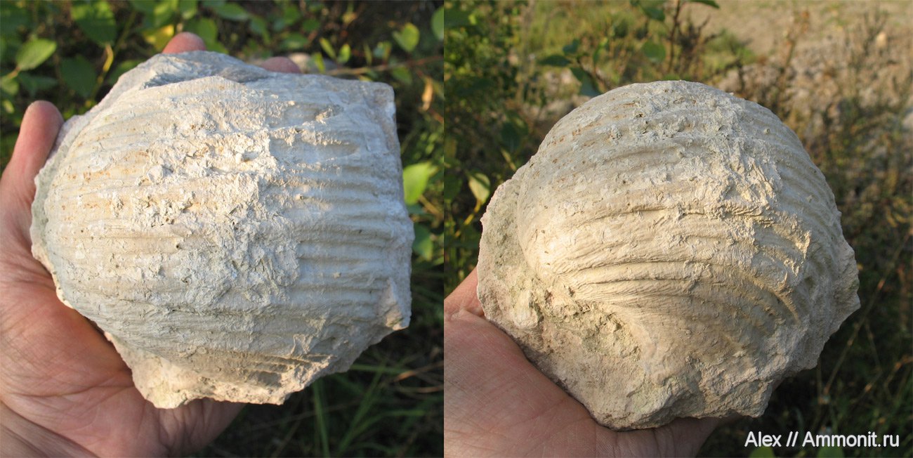 Хорошо сохранившаяся раковина брахиоподы Gigantoproductus. Карьер Змеинка, 2009 год.