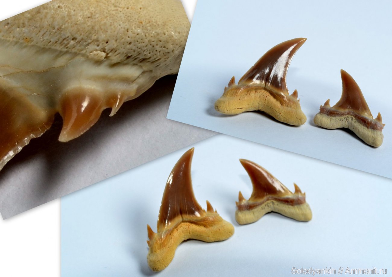 Боковые зубы палеогеновой акулы Jaekelotodus. Вид с лабиальной стороны и боковые зубцы крупным планом.
