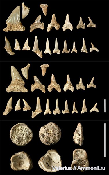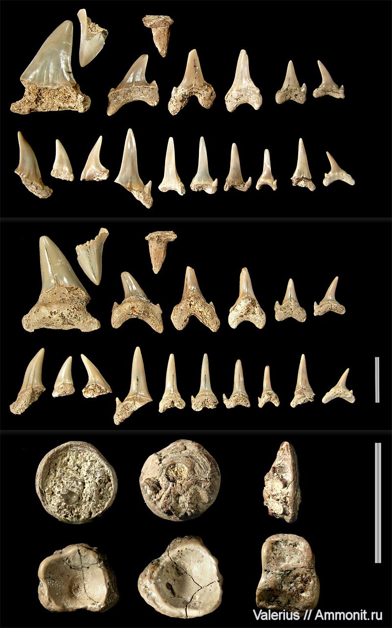 Зубы акул различных видов сеноманского века верхнего мела. Может кто-то обратит внимание на второй маленький зуб в верхнем ряду (вверх ногами). Не очень похож на акулий, возможно зуб рыбы. Для зубов и позвонков разные сантиметровые масштабные метки.