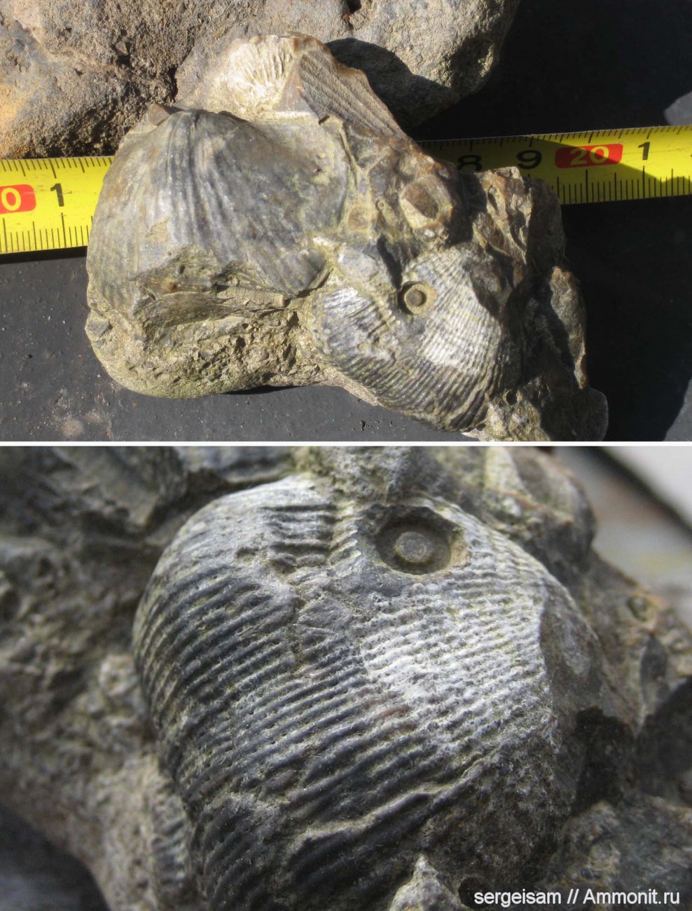 У меня единственное предположение, что это отпечаток членика криноидеи. Ведь это не сама раковина, а ее слепок, а членик лилии мог завалиться внутрь пустой уже створки и был закрыт осадком. Осадок окаменел, сохранив форму раковины и членика, а сами объекты растворились. | ||||||