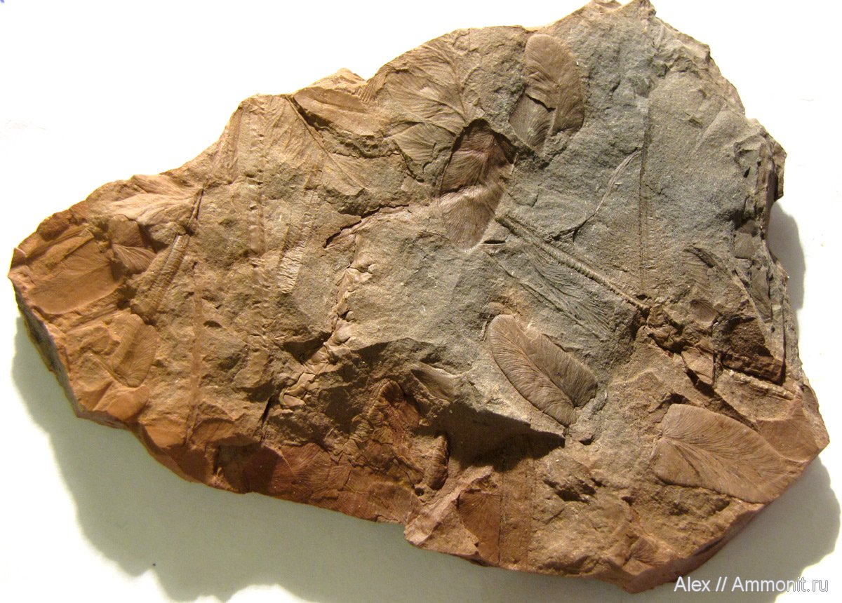 И я очень прошу помочь с определением - пока я растения различаю не очень хорошо и узнаю только Neuropteris и вроде бы вверху Mariopteris. Все остальное - продолговатые листья в левой части и похожий на перо листик рядом с веточкой или рахисом мне незнакомы.