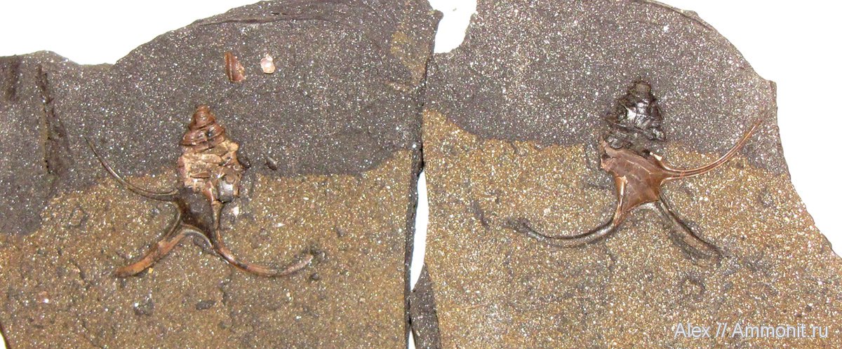 В оксфордских глинах встречаются не только отпечатки аммонитов, но и гастроподы, часто тоже в виде отпечатков. На этом фото - отпечаток и противоотпечаток гастроподы Dicroloma cochleata.