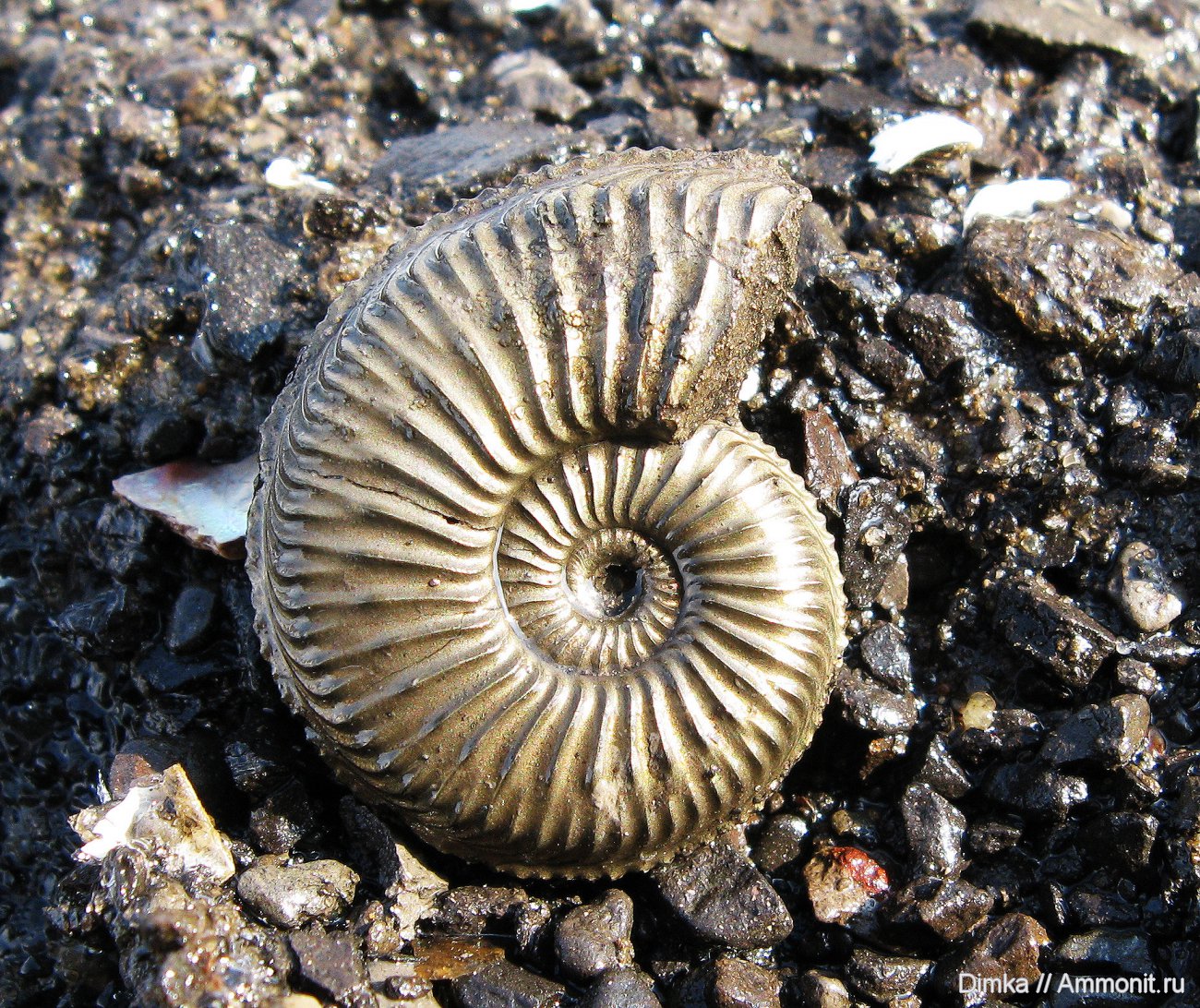 На уже вымытых рекой из глины раковинах аммонитов, которые иногда вдоль берега встречаются даже целыми, перламутр не всегда сохраняется.