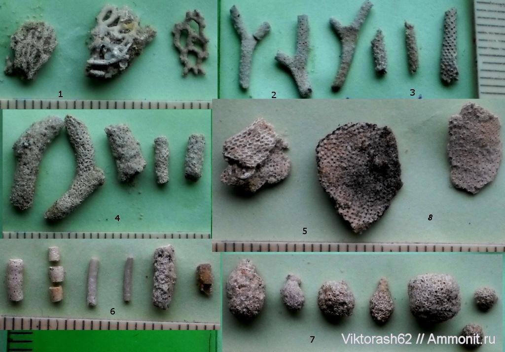 1. Reteporina. 2.Ceriopora micropora Coldfuss. 4.Tabulipora maculosa. 7.Berenicea Lamouroux. Других не смог. Кто может чем-то помочь с определением мшанок, подскажите.
