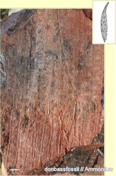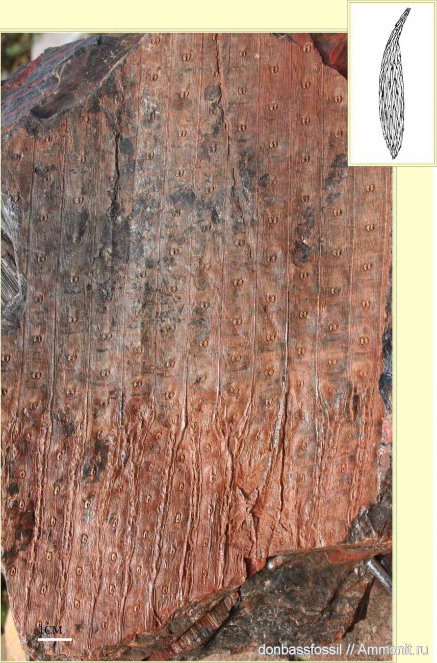Образец из коллекции Бруно Валуа (Bruno Vallois), Франция. Интересен тем, что на нем можно видеть как обычные листовые рубцы, так и рубцы фертильных побегов (схематически изображены на врезке), размещены в нижней части фото.