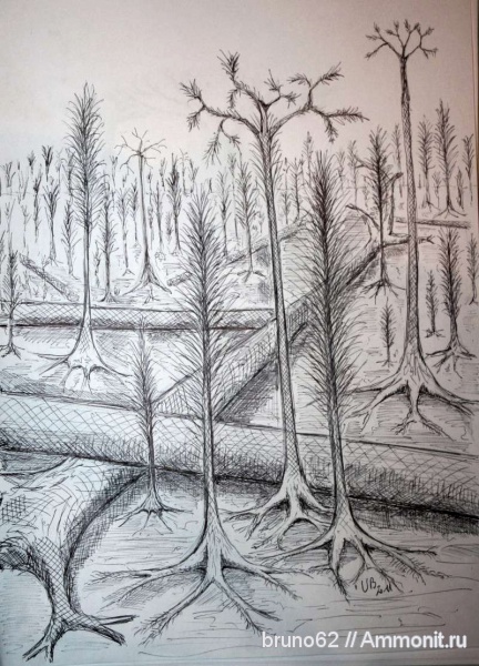 "This afternoon I started to daydream, I imagined a marshy plain or a large delta. A tropical storm devastated the Carboniferous Lepidodendron forest , extending to the ground some giant trees...Thus space and access to light have been released...Then came a period of quiet to lull conducive to the resumption of a new generation of lepidophytes, I present a drawing of my composition and I summarized the events that I listed above ....This is why I love Paleobotany because it allows to escape and sometimes the findings are a perfect illustration of dreams ......"