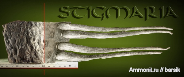 В основании стволов плауновидных в виде мощной опоры располагались четыре горизонтальных, многократно дихотомически ветвившихся органа - стигмарии . На их поверхности формировались немногочисленные короткие неветвящиеся корни.