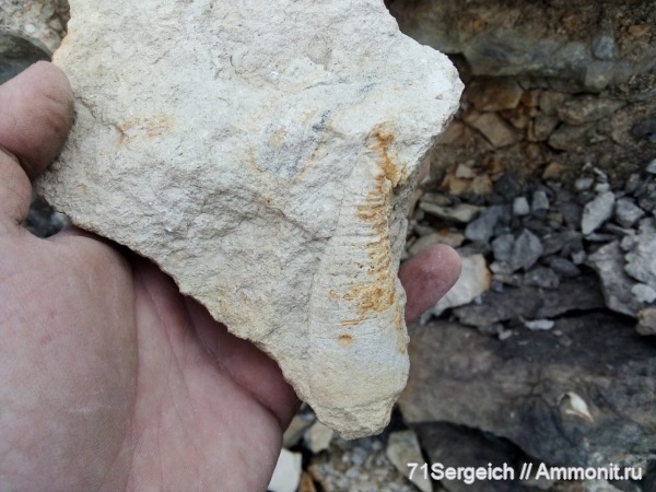Этой весной обнажились данные отложения. Сегодня туда съездили. Отложения очень богаты окаменелостями. Гигантопродуктусов вообще моря, от мелких до размеров с полторы две ладони. Есть гладкие, есть шипастые. Аммониты, коралы и т.д. Некоторые слои белого известняка плохо поддаются откалыванию. Слои из черного известняка более мягкие, в них попалось несколько трелобитов. Остальное не понятное выкладываю сюда.